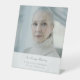 Honor your loved one with a beautifully designed pedestal tabletop funeral photo sign, created to serve as a heartfelt tribute during a funeral, memorial service, wake, or celebration of life. This elegant memorial table sign features classic script and "in loving memory" phrase. Add your cherished picture along with custom name and dates, offering a meaningful way to say in loving memory.