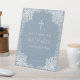 Un signe de bienvenue bleu poussiéreux. Il a un cadre vintage et orné de fausse feuille d'argent de branches complexes avec des feuilles. Au-dessus du texte, il y a une croix, également à partir de fausse feuille d'argent. L'arrière - plan est bleu poussiéreux, tout le texte est gris clair et peut être changé.