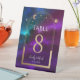 Cosmic Purple Turquoise Or Soleil Lune Astronomie Mariage Numéros de tableau Piédestal Signal présente soleil doré, lune et étoiles avec un cadre doré sur coloré mystique violet, turquoise et bleu arrière - plan cosmique. À l'intérieur, il y a vos informations de numéro de table personnalisées. Conçu pour vous par Evco Studio www.zazzle.com/store/evcostudio