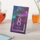 Cosmic Purple Turquoise Or Soleil Lune Astronomie Mariage Numéros de tableau Piédestal Signal présente soleil doré, lune et étoiles avec un cadre doré sur coloré mystique violet, turquoise et bleu arrière - plan cosmique. À l'intérieur, il y a vos informations de numéro de table personnalisées. Conçu pour vous par Evco Studio www.zazzle.com/store/evcostudio