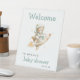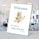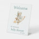 This cute baby shower welcome sign features a watercolor teddy bear in an astronaut suit, riding a rocket ship below the word "Welcome" and above the words "baby shower" in blue-green hand printing. Add the name of the mom-to-be and the date in charcoal gray sans serif font.