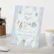 The Diaper Raffle Pedestal Sign features a custom hand-painted frame of a crisp blue vertical stripe pattern accented with a lush greenery wreath, creating a clean, classic, and welcoming look. A sweet watercolor clothesline is strung across the center, proudly displaying tiny, adorable items, each featuring a cute bunny dressed in blue. The scene is completed with a darling blue bow holding a bunch of fresh carrots, and bright, cheerful daffodils, all rendered in a soft watercolor style. Easily add your own details and change the font style, size color and placement if you would like to.