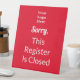 Vous pouvez modifier le texte d'affichage blanc pour créer un message personnalisé pour votre entreprise. Le panneau rouge indique : Désolé, ce registre est fermé. La ligne supérieure du texte affiché est un script. Une image d'affichage est en haut. Vous pouvez remplacer l'image par le logo de votre entreprise.