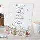 Feminine et moderne, cette enseigne "Guess How Many Kisses" utilise un design qui comprend un joli jardin de fleurs rose et violette aquarelle comprenant des roses, tulipes, lavande et eucalyptus verdure avec des papillons de couleur vive et des abeilles bourdonnantes volant autour. Vous pouvez customiser tous les détails du texte et du placement graphique à vos besoins spécifiques.