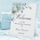 Bienvenue à votre 100ème anniversaire avec cet élégant design floral bleu poussiéreux. Un luxuriant arrangement de fleurs bleues est placé au sommet. L'accueil est écrit dans une grande police tendance. Le reste du texte est une combinaison classique d'une police droite et d'une police italique. Très facile à customiser. Ce panneau est facile à utiliser et peut être placé dans une variété d'emplacements.