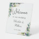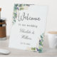 Bienvenue à un mariage élégant. Un arrière - plan blanc chic. Décoré avec des feuilles d'eucalyptus couleur verte, des sprigs, de la verdure, des feuilles faux or. Personnalisez et ajoutez les noms de la mariée et du marié ainsi qu'une date.