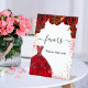 Un panneau de faveur de fête. Un fond blanc avec des étincelles de faux brillant rouge, une robe rouge et des roses rouges, des fleurs.