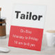 Ce guéridon est rouge vif et blanc. Vous pouvez modifier le texte pour répondre à vos besoins. Vous pouvez vouloir afficher un message personnalisé tel que votre service, le nom de la société et les heures. La moitié supérieure est blanche avec un gros texte noir. La moitié inférieure est rouge avec trois lignes de texte blanc.