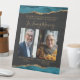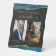 Un élégant signe pour honorer deux membres de la famille disparus à votre mariage. Bordures d'agate bleu turquoise en aquarelle bordées de parties scintillant en faux or décorent le dessus et le bas sur un arrière - plan noir en ardoise foncée. Les mots "In Loving Memory" apparaissent dans la calligraphie de l'écriture manuscrite de couleur or, avec le texte modifiable dans la police serif. Remplacez facilement l'échantillon d'images par des photos verticales de vos proches.