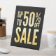 Élevez l'affichage de votre table avec cet élégant panneau de piédestal noir et or, parfait pour présenter votre Jusqu'à 50% de réduction de vente dans le style. Idéal pour les boutiques, les pop-up, les foires artisanales et les stands de vendeurs, cette enseigne ajoute une touche de luxe tout en attirant l'attention sur votre offre spéciale. Le design audacieux et moderne permet de se démarquer et de compléter le thème de la décoration. Placez-le simplement sur votre comptoir ou sur votre table d'affichage pour mettre à jour instantanément votre configuration commerciale.