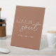 Panneau de table dessert mariage sur mesure avec typographie de style moderne "love is sweet" sur arrière - plan couleur terre cuite.