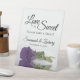 Ce joli panneau de table est parfait pour une table de régal à votre réception de mariage. Il présente un design simple mais élégant avec une photo d'un seul rose améthyste à longue tige couleur violet réfléchissant dans un bassin d'eau avec des vagues et des ondulations. Le panneau dit : L'amour est doux, s'il vous plaît prenez un régal! Il y a de la place pour vos noms et la date du mariage ci-dessous.