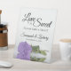 Ce joli panneau de table est parfait pour une table de régal à votre réception de mariage. Il présente un design simple mais élégant avec une photo d'un seul rose à long tige couleur lavande violet réfléchissant dans un bassin d'eau avec vagues et ondulations. Le panneau dit : L'amour est doux, s'il vous plaît prenez un régal! Il y a de la place pour vos noms et la date du mariage ci-dessous.