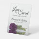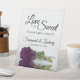 Ce joli panneau de table est parfait pour une table de régal à votre réception de mariage. Il présente un design simple mais élégant avec une photo d'un seul rose couleur prune pourpre à long tige réfléchissant dans un bassin d'eau avec vagues et ondulations. Le panneau dit : L'amour est doux, s'il vous plaît prenez un régal! Il y a de la place pour vos noms et la date du mariage ci-dessous.
