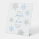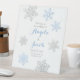 Abordable lapis bleu, gris argenté (gris) flocon de neige d'hiver personnalisé mariage accueil guéridon signe. Le design comprend des flocons de neige gris argent et bleu lapis audacieux et modernes. REMARQUE : Il s'agit d'un design imprimé plat sans embellissement en relief ou en 3D. C'est un grand guéridon de bienvenue mariage bon marché pour un mariage en hiver avec un thème lapis bleu et argent flocon de neige.