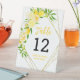 This beautiful and elegant wedding table number sign features watercolor citrus lemons and foliage on a gold geometric frame. The text combines handwritten script and serif fonts for a stylish and modern look. This is perfect for a spring or summer rustic wedding.