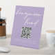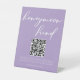 Ce magnifique panneau de guéridon de fonds lilas en lune de miel présente une belle typographie blanche sur un arrière - plan mauve doux avec votre code QR pour un mariage de printemps dans l'après-midi. La décoration pastel de lavande est un choix délicat de couleurs pour un élégant jardin.