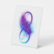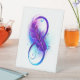 Symbole de l'infini avec une belle plume peinte en couleurs vives violettes et bleues sur fond blanc.