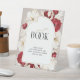 Un élégant panneau de piédestal avec des roses rouges rubis et des fleurs blanches douces, invitant vos invités à laisser leur amour et leurs souhaits dans votre livre d'hôtes avec un charme intemporel.