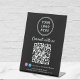 Panneau moderne noir "connectez-vous avec nous" pour votre entreprise avec votre code QR pour les clients à scanner pour effectuer un paiement, pour une liste de vos produits, services et prix, pour les rendez-vous, pour s'inscrire, etc. Téléchargez votre logo et votre code QR et ajoutez votre nom d'entreprise, votre numéro de téléphone, votre adresse municipale ou d'autres informations dans une simple typographie blanche et ajoutez vos identifiants utilisateur instagram et facebook pour que les clients puissent vous suivre sur les médias sociaux.