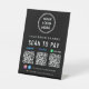 Simple moderne table top noir panneau de piédestal pour votre entreprise avec Venmo, Paypal et CashApp QR codes pour les clients à scanner pour les paiements. Ajoutez votre logo, vos codes QR, votre nom d'entreprise, votre numéro de téléphone et votre site Web dans une simple typographie blanche. Ajoutez vos identifiants instagram et facebook pour que les clients puissent vous suivre sur les médias sociaux.