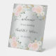 Un conseil d'accueil pour un mariage. Un arrière - plan élégant à l'allure fausse argent décoré de fleurs blanches et roses rousses. Personnalisez et ajoutez vos noms et la date du mariage. Lettres noires.