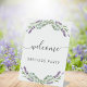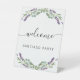 Un signe de bienvenue pour une fête. Un arrière - plan blanc, décoré de lavande, de fleurs et de verdure d'eucalyptus. Personnalisez et ajoutez votre nom. Lettres noires.