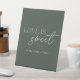 Panneau de table dessert mariage sur mesure avec typographie de style moderne "L'amour est doux" sur arrière - plan vert sauge foncé.