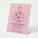 A modern pink monochrome tabletop pedestal sign designed for a chic bachelorette weekend setup. Clean typography, playful disco ball details and a soft feminine palette create a polished decorative accent for welcome tables, dessert displays or gift areas. Perfect for tying the entire celebration together with a cohesive, minimalist aesthetic.