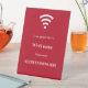 Symbole Wi-Fi. Ajoutez votre nom wi-fi et votre mot de passe pour vos clients/invités. Arrière - plan rouge, texte blanc.
