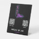 Flèche néon rétro "Mange ici" avec texte de conseil virtuel personnalisable et codes QR sur arrière - plan gris. Utilisé pour les camions alimentaires mobiles, les restaurants et autres établissements de restauration.
