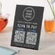 Panneau de piédestal noir moderne pour votre entreprise avec les codes QR Venmo et Paypal pour les clients à scanner pour les paiements. Entrez les liens vers Venmo et Paypal pour créer des codes QR pour les clients à analyser pour les paiements. Ajoutez votre logo et votre nom commercial, votre numéro de téléphone et votre adresse de rue dans une simple typographie blanche.