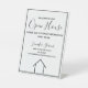 Ce guéridon Open House noir et blanc élégant est fait sur mesure avec le nom de votre entreprise immobilière et les coordonnées de votre agent immobilier. Impressionnez les nouveaux clients d'achat de maison avec cette signalétique simple et chic avec ce panneau de typographie classe. Un dessin moderne et minimaliste d'une maison se trouve sous l'information de l'agent immobilier.