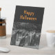Le panneau de la fête de la table est en noir et blanc photo de pierres tombales du cimetière avec personnalisable Happy Halloween texte sur l'arrière - plan noir fait le salut parfait Halloween!