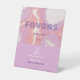 Le Pink Pastel Abstrait Art Wedding Favors Pedestal Sign apporte une touche de mariage pastel moderne et tendance. L'art abstrait est constitué d'un mélange de couleurs corail, rose et blanc qui est équilibré, pas trop audacieux ni léger en complément de la typographie blanche et violette. Avec la typographie moderne, il crée un nouveau style, à part le mariage traditionnel ou un mariage typique.