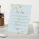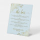 Ce panneau de table est une excellente façon de faire connaître à vos invités le menu du bar à votre réception de mariage. Il présente un design simple mais élégant, avec des boucles en faux feuille doré et des tourbillons sur un arrière - plan bleu poudre pâle. Le titre est écrit en écriture de calligraphie en or et dit : Le Bar. Il y a de la place pour le menu des boissons ainsi que les noms du couple et de la date du mariage.