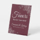 Ce joli panneau de table est conçu pour invitation vos invités à prendre une faveur de mariage. Il présente un design bordeaux et argenté simple mais élégant, avec des lettres de script fantaisistes et des boucles et tourbillons délicats dans les coins. Le panneau dit : Faveurs, prenez-en une ! Il y a de la place pour vos noms et la date du mariage ci-dessous.