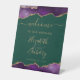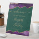 This elegant wedding welcome sign features top and bottom borders of watercolor agate geode in shades of purple with faux gold highlights. The word "welcome" and couple's names appear in modern gold-colored handwriting font on an emerald green background.