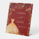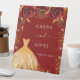 Le panneau présente une parties scintillant en faux or scintille sur un arrière - plan rouge avec une robe dorée et des roses rouges, des fleurs. Avec le texte : Cartes et Cadeaux, merci!
