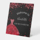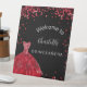 Un signe de bienvenue pour une Quinceañera, fête du 15e anniversaire. Un arrière - plan noir à la fausse parties scintillant rouge, brille, une robe. Personnalisez et ajoutez un nom.