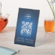 Un panneau de table noir moderne et simple qui permet à vos clients, clients et invités de se connecter facilement à votre réseau WiFi. Téléchargez votre code QR et votre logo, et ajoutez d'autres détails comme votre nom de réseau et votre mot de passe en lettres blanches.