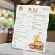Carte des prix de menu pour un restaurant ou un vendeur de street food illustrant l'illustration de Destei d'une restauration rapide, dont une boisson orange avec une paille rouge, un hot dog avec ketchup et moutarde sur le dessus et un hamburger avec un pain de sésame rempli de fromage, laitue, boeuf, tomate, ketchup et pickles. Il y a plusieurs zones de texte personnalisables pour lister différents types de repas et d'autres options de menu. En haut, il y a même un endroit pour un logo personnalisé. Personnalisez ce design pour répondre aux besoins de votre entreprise.