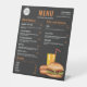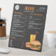 Carte des prix de menu pour un restaurant ou un vendeur de street food illustrant l'illustration de Destei d'une restauration rapide, dont une boisson orange avec une paille rouge, un hot dog avec ketchup et moutarde sur le dessus et un hamburger avec un pain de sésame rempli de fromage, laitue, boeuf, tomate, ketchup et pickles. Il y a plusieurs zones de texte personnalisables pour lister différents types de repas et d'autres options de menu. En haut, il y a même un endroit pour un logo personnalisé. La couleur arrière - plan est très gris foncé, presque noire. Personnalisez ce design pour répondre aux besoins de votre entreprise.