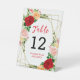 This beautiful and elegant wedding table number sign features watercolor red, pink and orange roses with foliage on a gold geometric frame. The text combines handwritten script and serif fonts for a stylish and modern look. This is perfect for a summer rustic wedding.