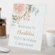 Un élégant arrière - plan blanc décoré d'or rose et de fleurs rose vif, de fleurs, d'eucalyptus, de sprigs dorés. Personnalisez et ajoutez un nom et un âge.