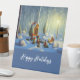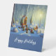 Un panneau de piédestal de saison des fêtes amusantes avec des scènes de forêt de Noël fantaisiste et surréaliste avec des arbres enneigés, créé avec un logiciel générateur d'IA. Le texte "Happy Holidays" sur arrière - plan bleu est personnalisable. Convient pour les bureaux, les magasins de détail ou la maison