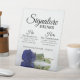 Ce panneau de table est parfait pour le bar à votre réception de mariage. Il présente un design simple mais élégant avec une photo d'un seul rose bleu marine à long tige réfléchissant dans un bassin d'eau avec vagues et ondulations. Le panneau indique : Signature Drinks, et il y a de l'espace pour son préféré et son préféré.