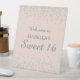 Soirée de 16 ans "Bienvenue" signe de piédestal avec parties scintillant en argent sur rose pâle doux, et texte écrit dans une élégante calligraphie / police de script. Les couleurs arrière - plans et textuelles de ce panneau sont entièrement personnalisables avec l'outil de design facile à utiliser de Zazzle afin de les concevoir avec les couleurs de votre partie. Contactez-moi pour obtenir de l'aide sur la personnalisation ou pour demander des produits correspondants ou coordonnés.