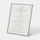 STATELY CALLIGRAPHY | Wedding Bar Menu Pedestal Sign. Features, black onyx color typography on ivory ecru color background with black and ivory stripe pattern border.