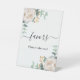 Fond blanc. Décoré de pivoines blanches, de feuilles d'eucalyptus verts fleuris, de sprigs, de verdure, de feuilles faux or. Avec le texte : Faveurs, s'il vous plaît prenez un!